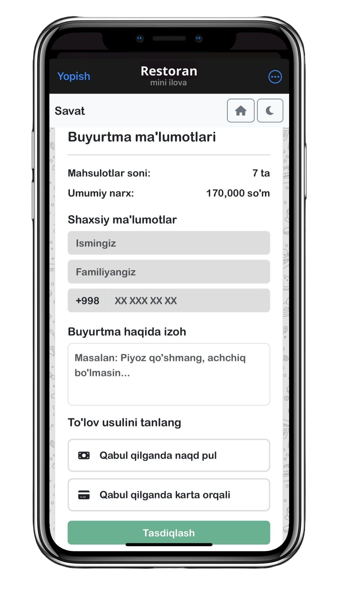 Mehmonga faqat QR kodini skanerlash orqali havolaga o'tish va ovqatga buyurtma berish kifoya. Ilova kabi ochiladi. Telegramda ishlaydi